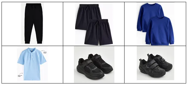 - Navy shorts / joggers / sweatshirt / hoody (these should not have branded slogans)